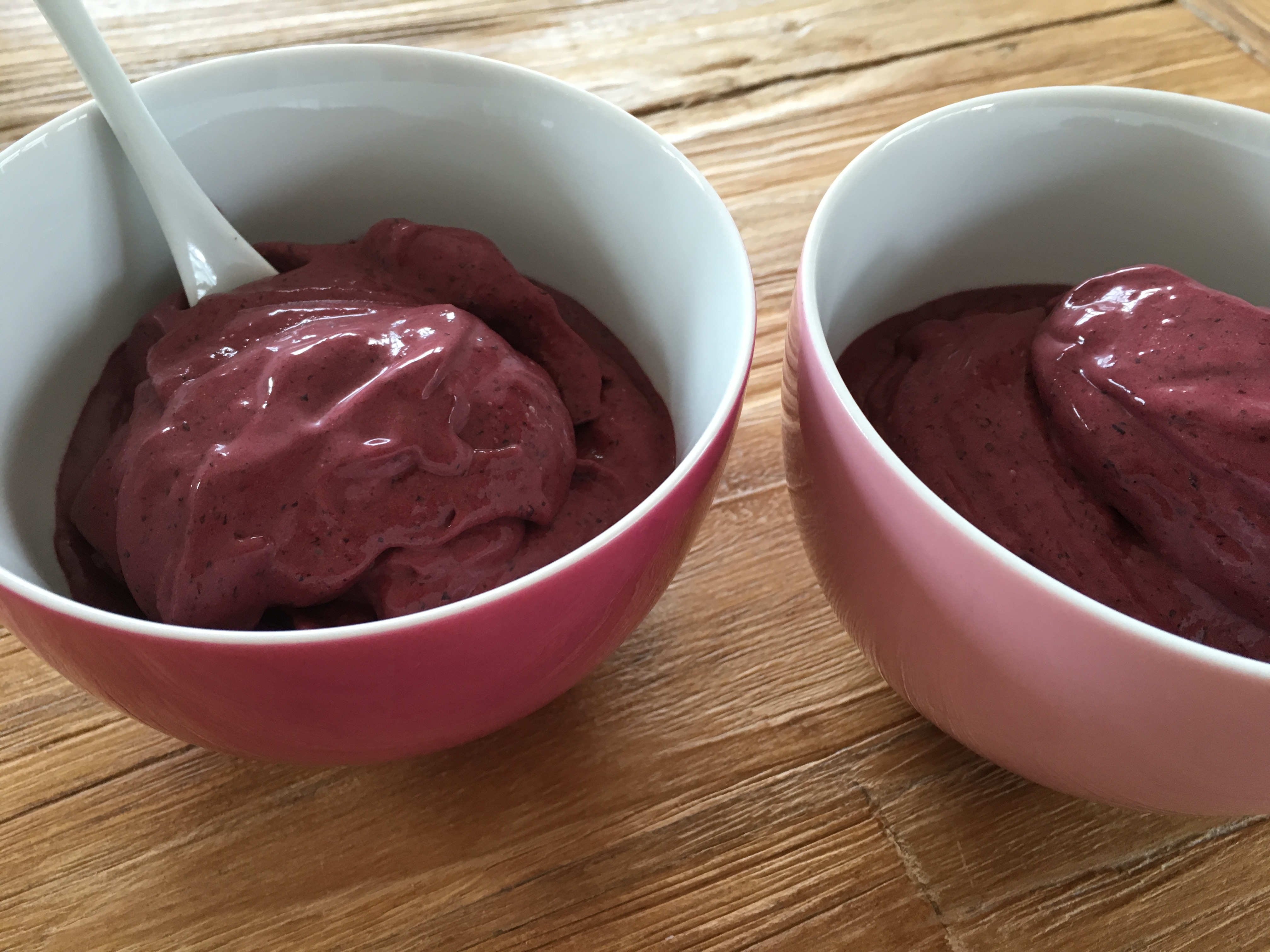 Die tiefgekühlten Beeren zusammen mit den restlichen Zutaten in den Smoothie-Mixer geben und alles kurz, aber gründlich unter Zuhilfenahme des Stößels auf höchster Stufe verrühren. Dann das Eis in Schälchen füllen und direkt genießen!