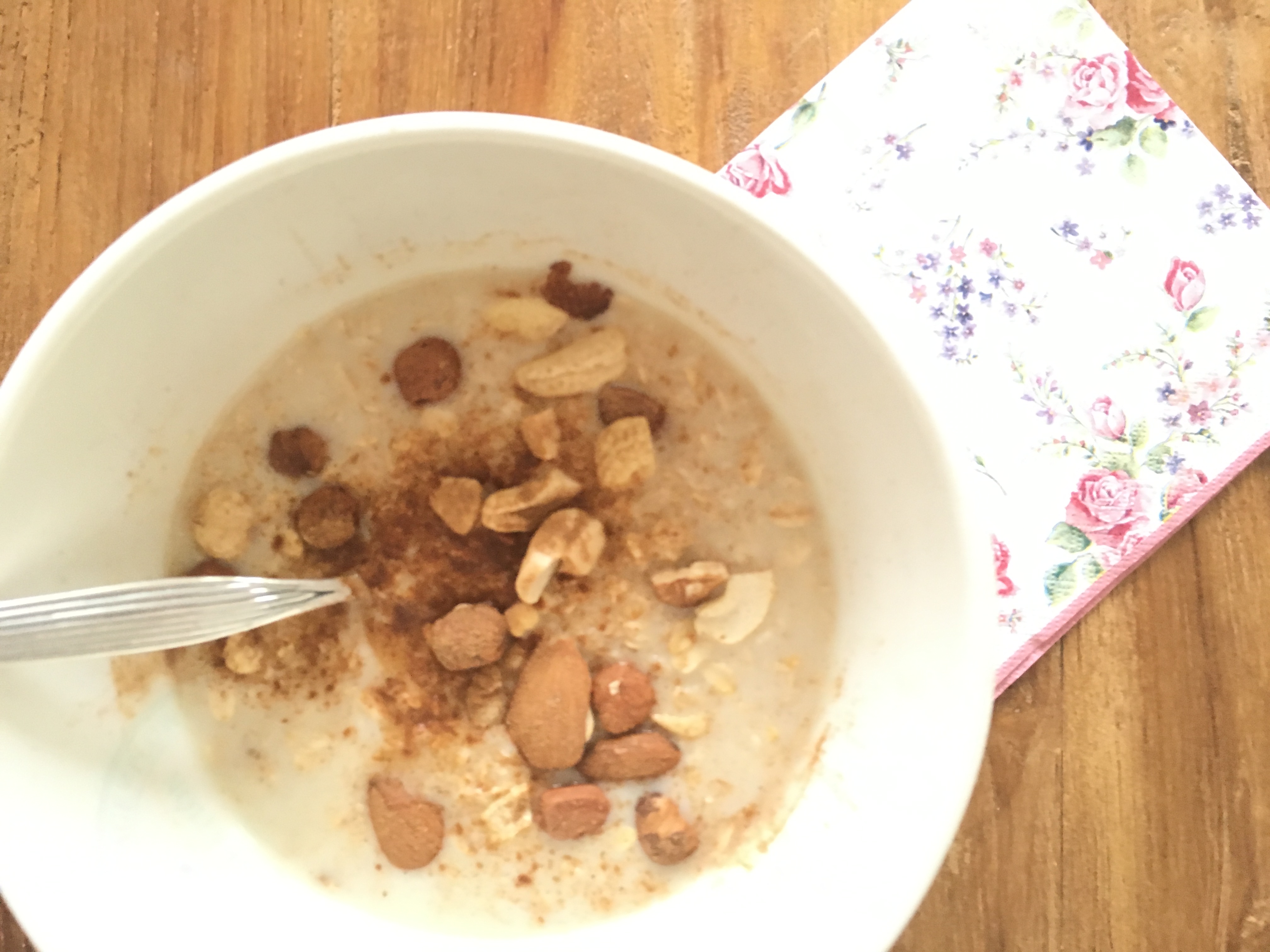 Die Zubereitung ist wirklich super einfach: Du gibst einfach die Hafermilch zusammen mit den Haferflocken in einen kleinen Topf und lässt beides unter ständigem Rühren einmal aufkochen. Jetzt nimmst du den Topf von der Herdplatte und lässt den Brei noch etwas ziehen; dabei bitte gelegentlich umrühren. Zum Schluss gibst du den Brei in ein Schale und streust ein paar Nüsse und -je nach Geschmack- noch etwas Zimt darüber.