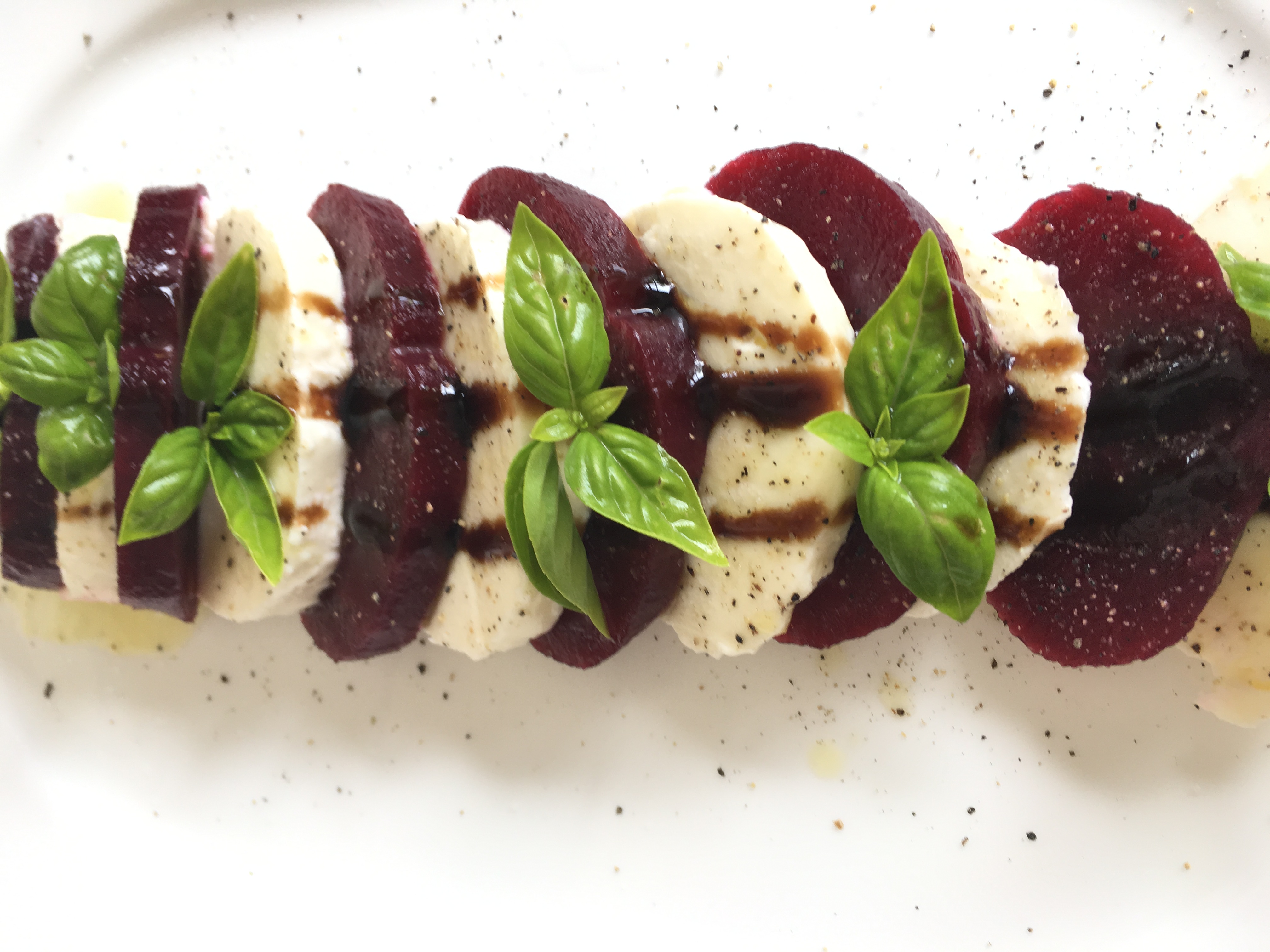Die Rote Beete und den Mozzarella in dünne Scheiben schneiden. Beides abwechselnd auf einem Teller anrichten, so dass sie zum Teil aufeinander liegen. Mit Salz und Pfeffer würzen und anschließend mit dem Olilvenöl und dem Balsamico Essig übergießen. Zum Schluss die Basilikum Blätter abspülen und auf der Caprese verteilen.