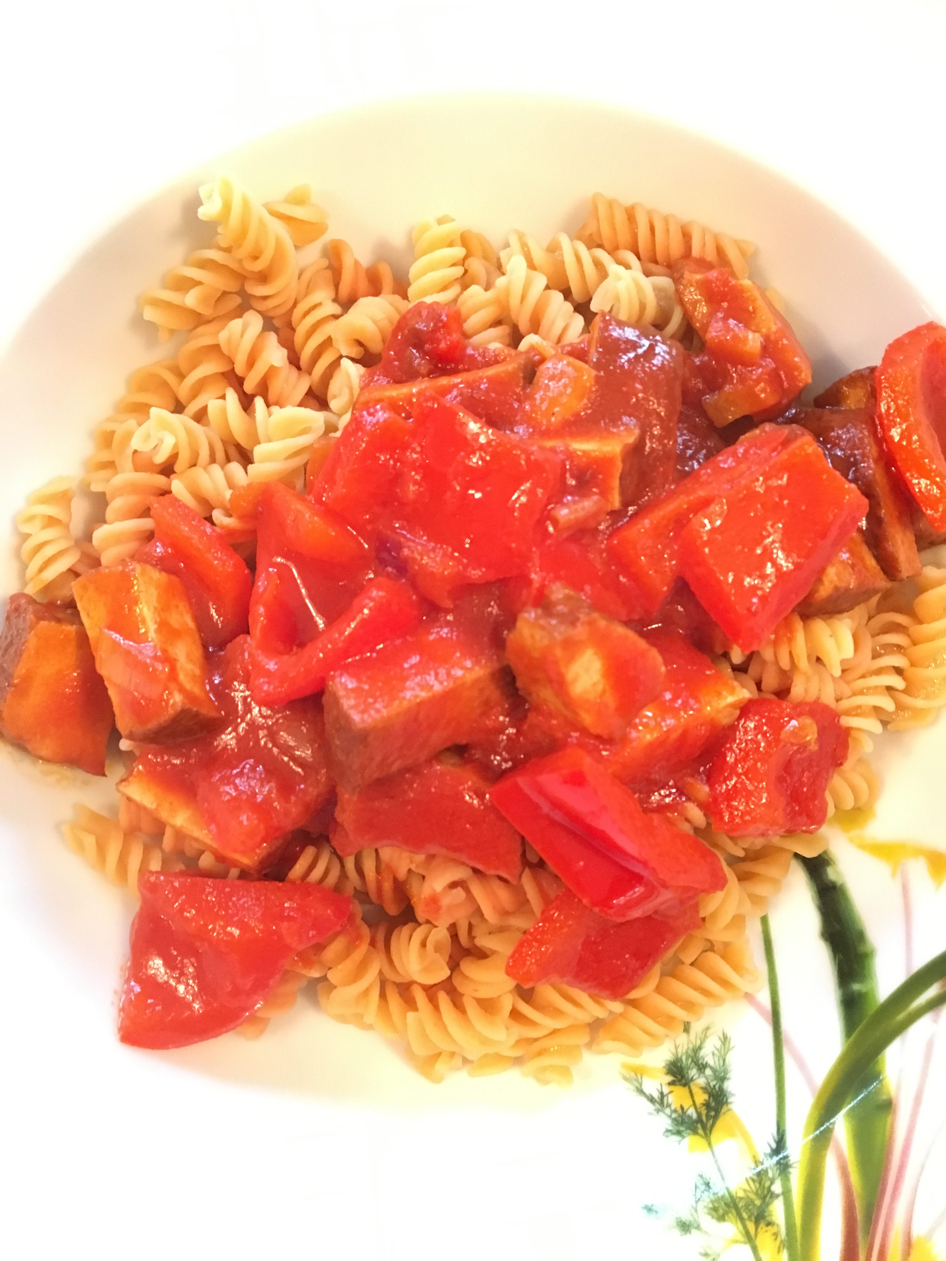 Diese Gericht steckt -dank der Rote Linsen Nudeln und dem Räuchertofu- voller wertvoller, pflanzlicher Eiweiße. Es schmeckt pikant und ist sehr schnell zubereitet. Das Tomatenmark liefert einen ganz besonderen „Stoff“, nämlich Lycopin. Lycopin gilt als Radikalenfänger und kann gesundheitschädigenden Molekülen im menschlichen Körper den Garaus machen. Es soll vor Krebs schützen und bei Herz-Kreislauferkrankungen helfen.