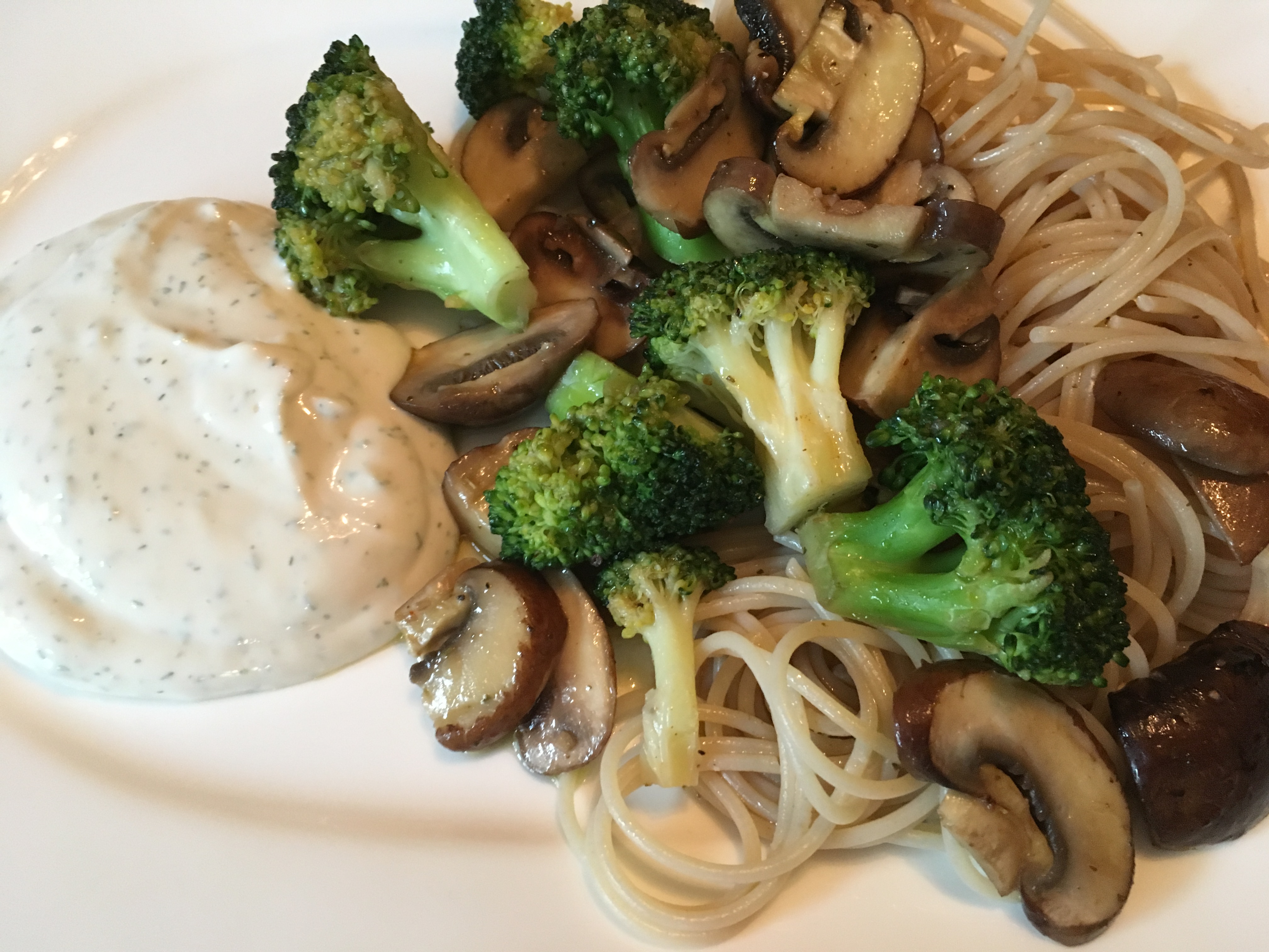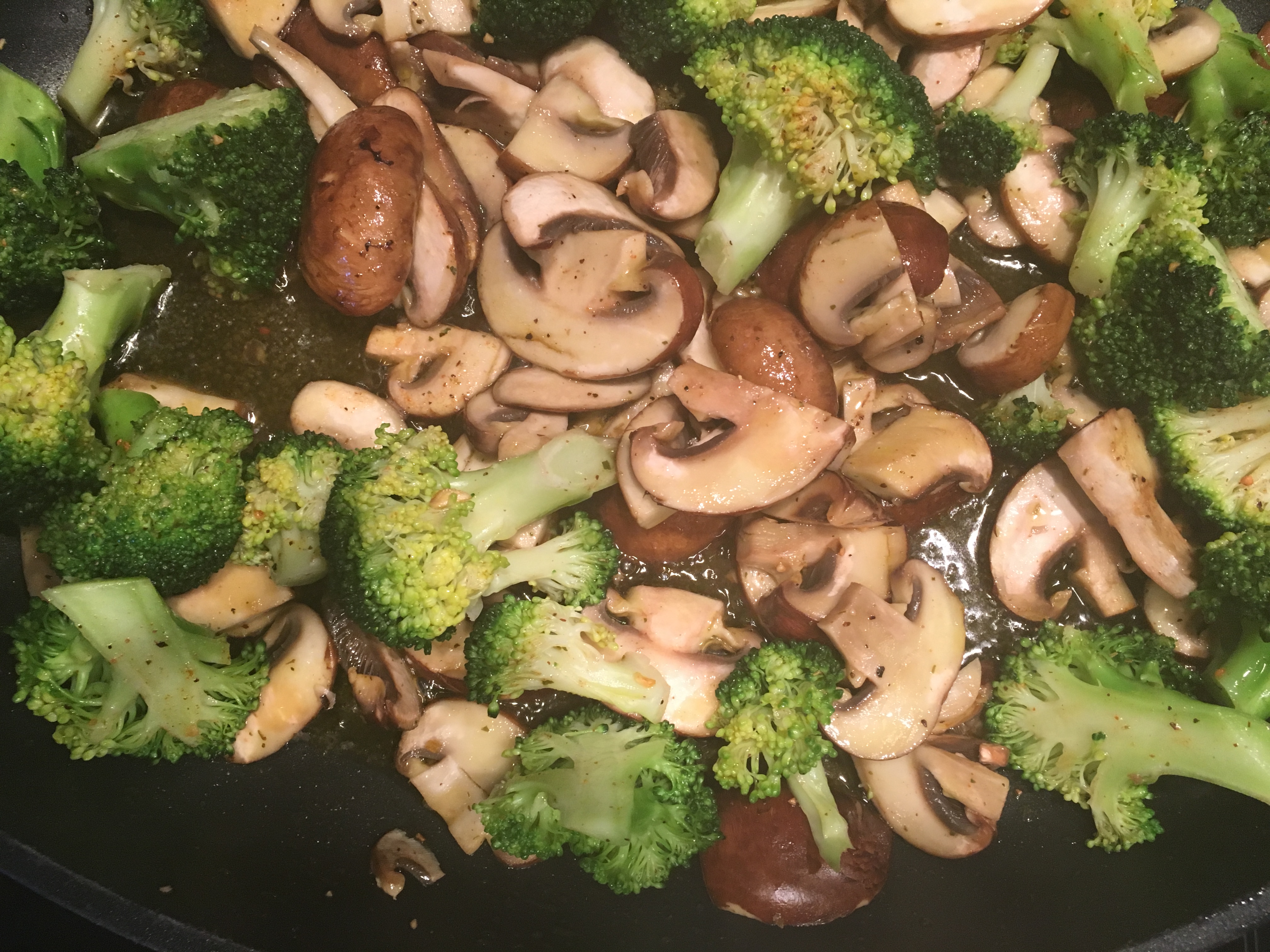 Broccoli in kleine Röschen brechen, waschen und in leicht gesalzenem Wasser kurz aufkochen lassen und anschließend mit kaltem Wasser abschrecken. So behält der Broccoli seine schöne, grüne Farbe. Champignons putzen und in Scheiben schneiden. Beides (Broccoli und Champignons) in einer großen Pfanne mit reichlich gutem Olivenöl leicht anbraten und mit Pfeffer und Salz würzen.
