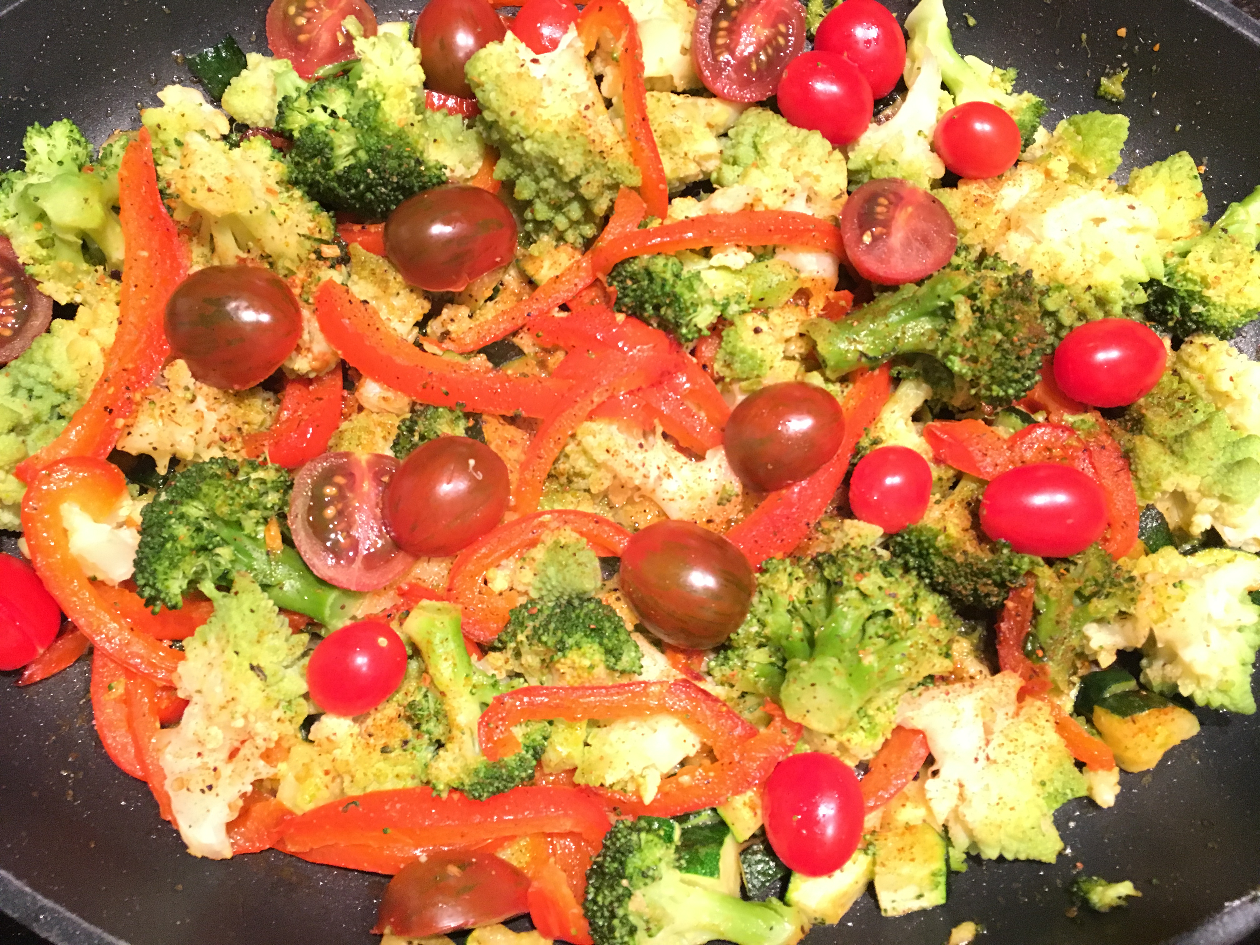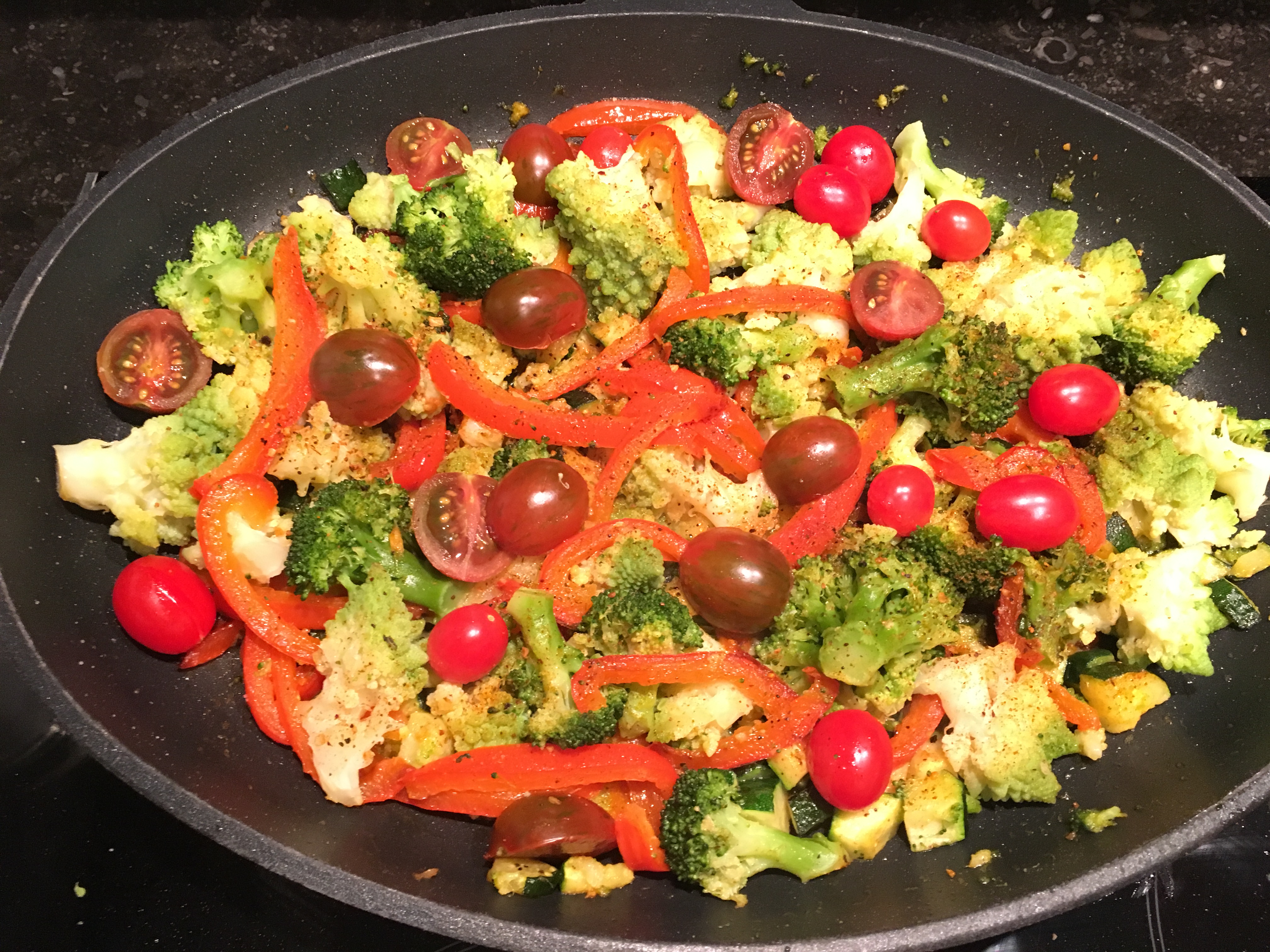 Paprikaschote waschen, vom Kerngehäuse befreien und in feine Streifen schneiden, Zucchini waschen und würfeln. Den Ingwer schälen und sehr fein hacken. In einer großen Pfanne das Öl erhitzen und Paprika, Zucchini und Ingwer darin anbraten. Nach etwa 4 Minuten den vorgekochten Romanesco, den Broccoli und die vorher gewaschenen Kirschtomaten in die Pfanne geben und kurz mitbraten. Das Gemüse nur so lange braten, dass alles noch etwas Biss hat. Zum Schluss die Gemüsepfanne salzen und würzen.
