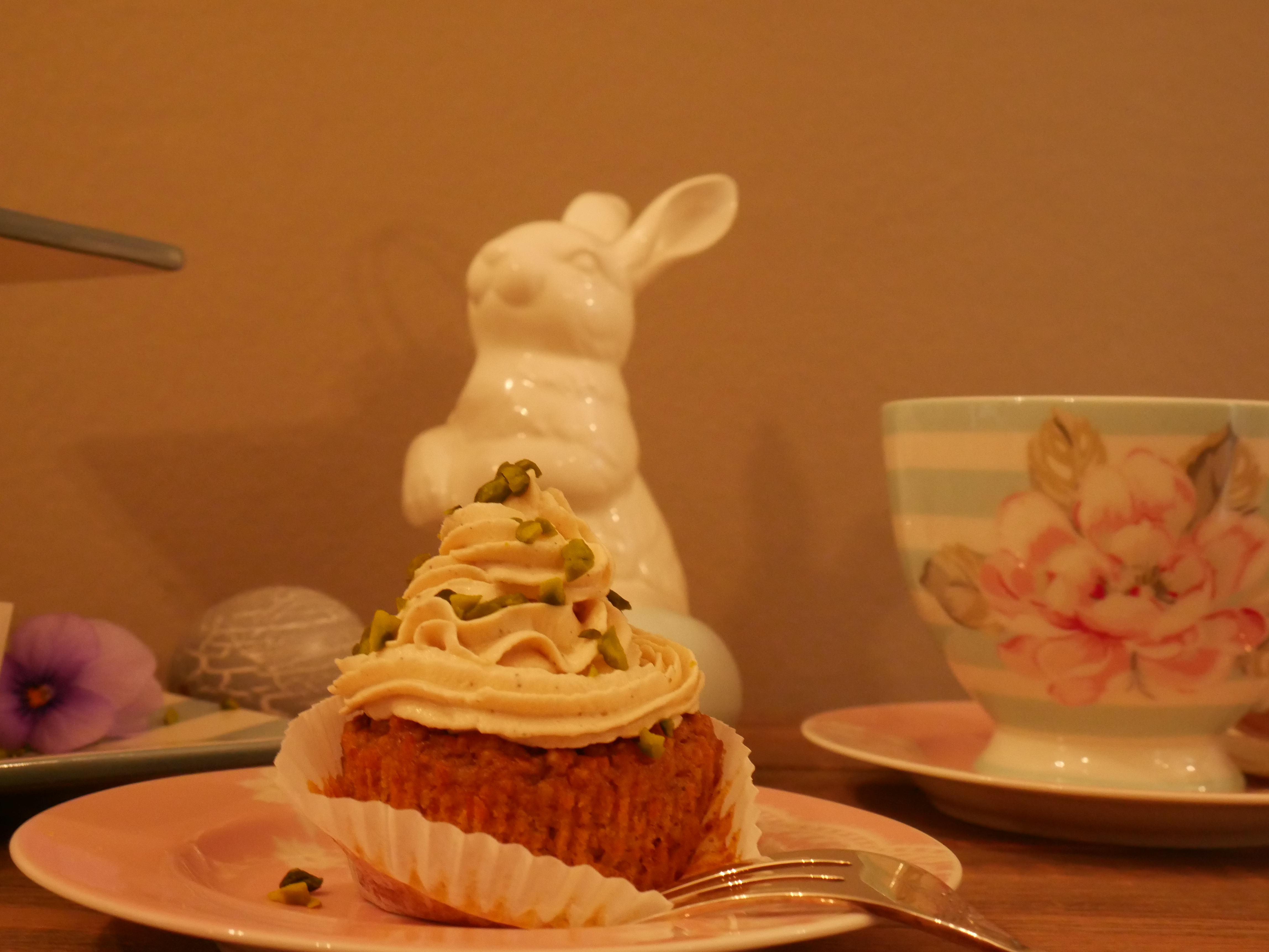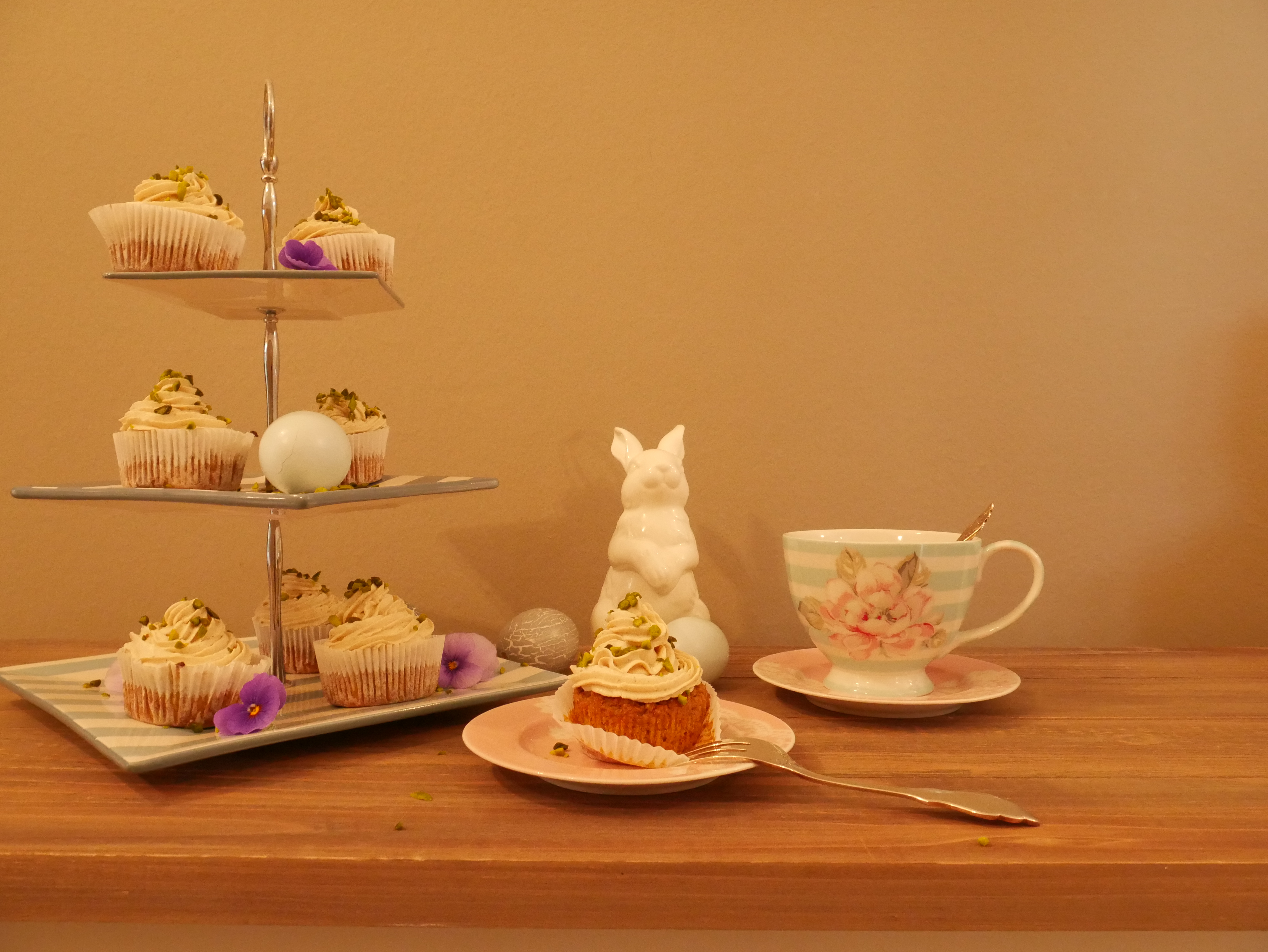 Mit dem Handrührgerät oder in der Küchenmaschine Mascarpone, Quark, Kokosblütenzucker und die gemahlene Vanille verrühren. Die Creme in einen Spritzbeutel füllen und die Muffins damit dekorieren. Zum Schluss mit Karottenraspeln oder gehackten Pistazien verzieren.