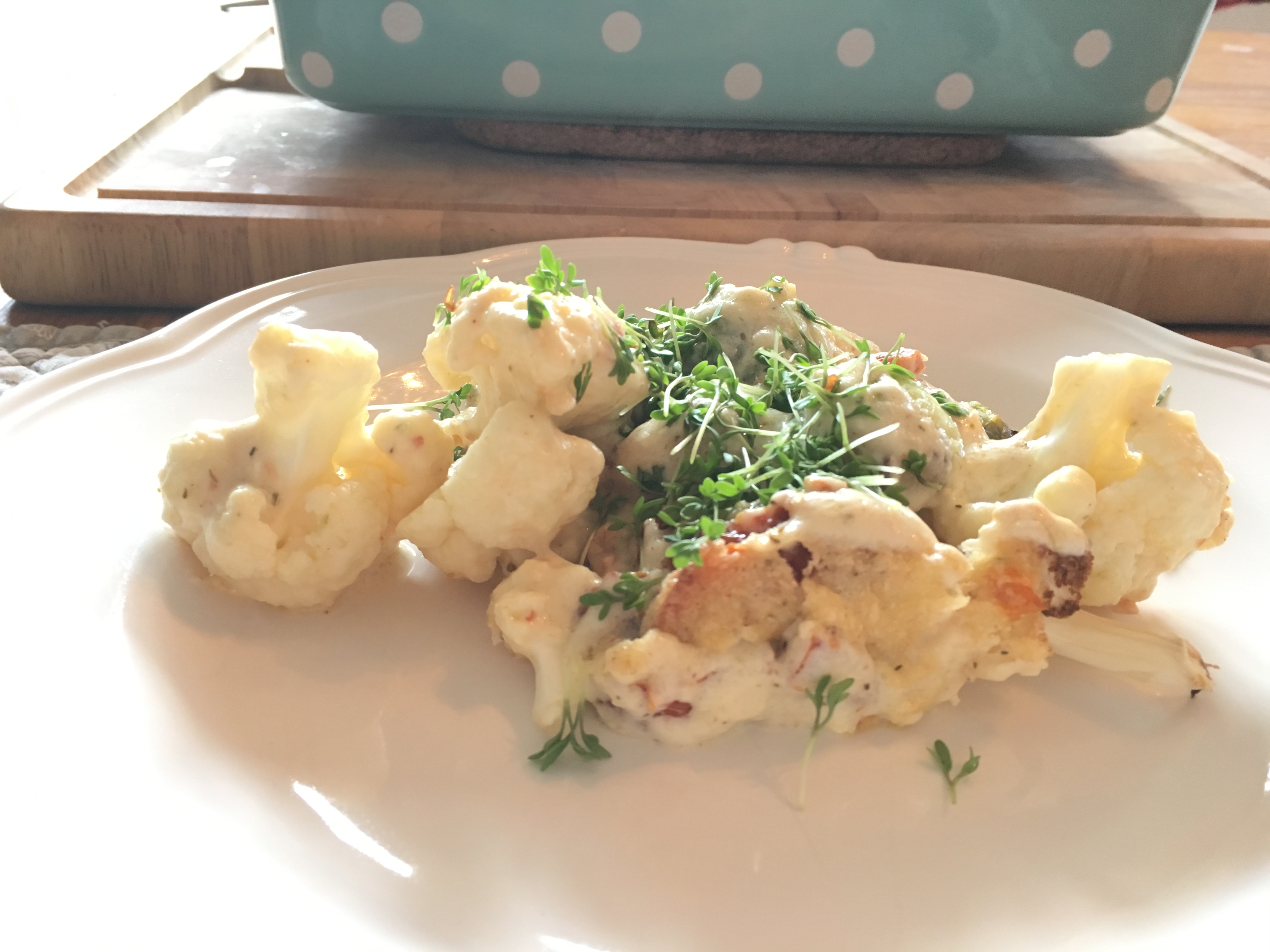 Rosenkohl schälen. Blumenkohl von Stunken und äußeren, grünen Blättern befreien. Den Blumenkohl in kleine, mundgerechte Röschen brechen. Rosen- und Blumenkohl kurz abspülen, abtropfen lassen und in eine Auflaufform legen. Die getrockneten Tomaten in kleine Stückchen schneiden. Dann die vegane Frischcreme mit den Tomatenstückchen verrühren. Dazu kommt das Olivenöl, in das die Tomaten eingelegt waren, Hefeflocken, Salz und geriebene Muskatnuss. Alles gut verrühren und über das Gemüse in die Auflaufform gießen. Das Ganze für ca. 30 Minuten überbacken. Wenn du möchtest, kannst du den Auflauf noch mit Kresse garnieren.