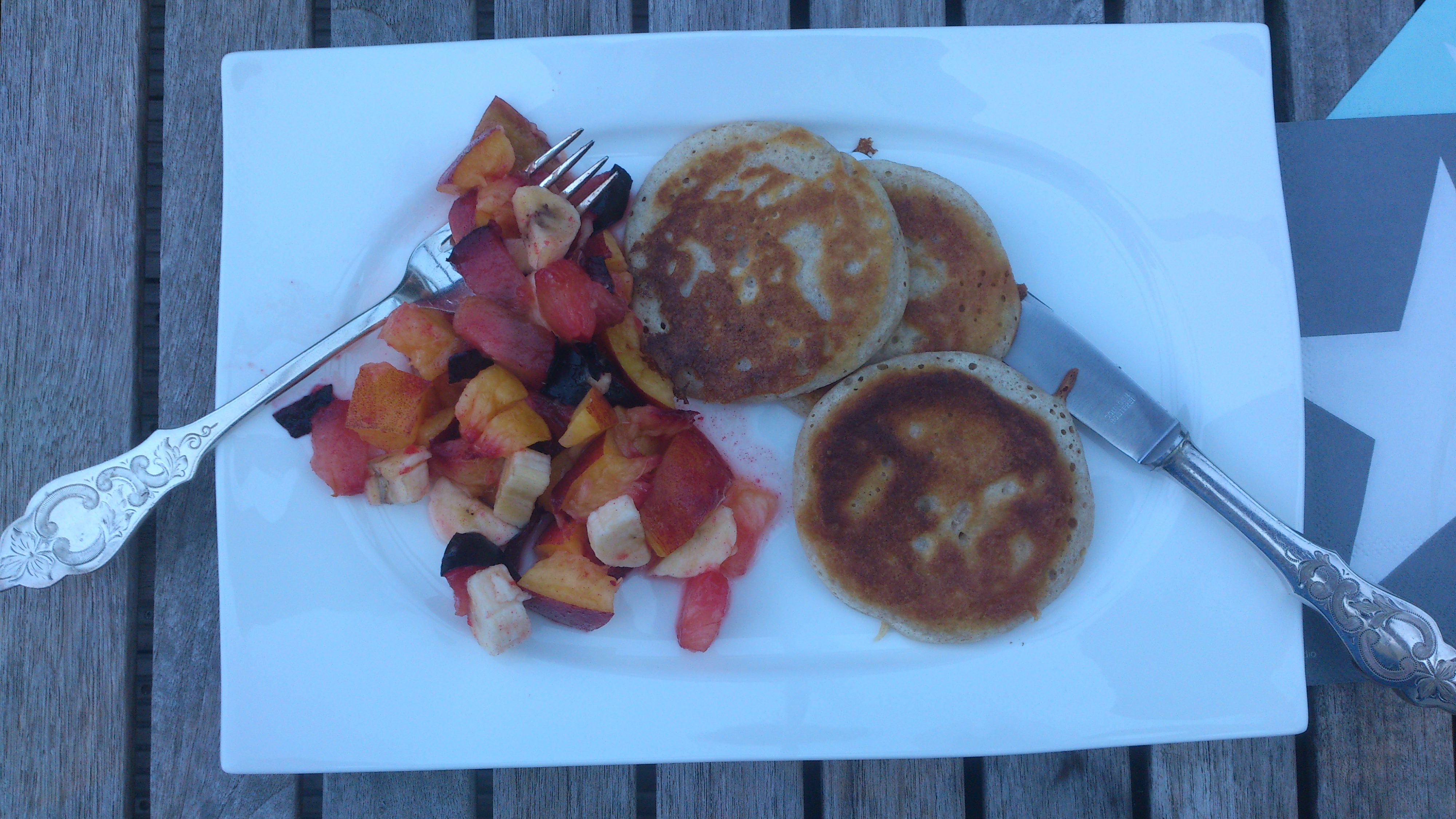 Aus den Früchten einen Obstsalat zubereiten und mit Zitronen- oder Limettsaft betreufeln, damit sich das Obst nicht verfärbt. Die goldgelb gebackenen Pfannkuchen zusammen mit dem Obstsalat anrichten und nach Belieben mit Kokosnussflocken oder Zimt bestreuen.