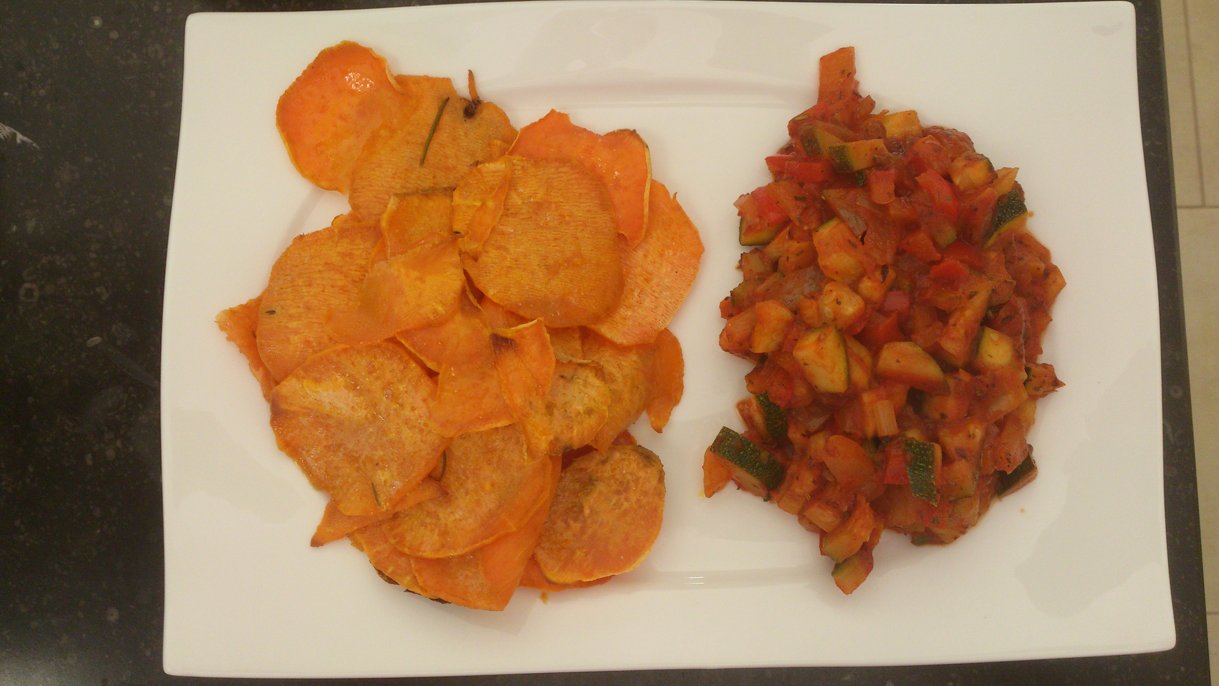 Die Süßkartoffeln mit dem Gemüse auf Tellern anrichten. Guten Appetit
