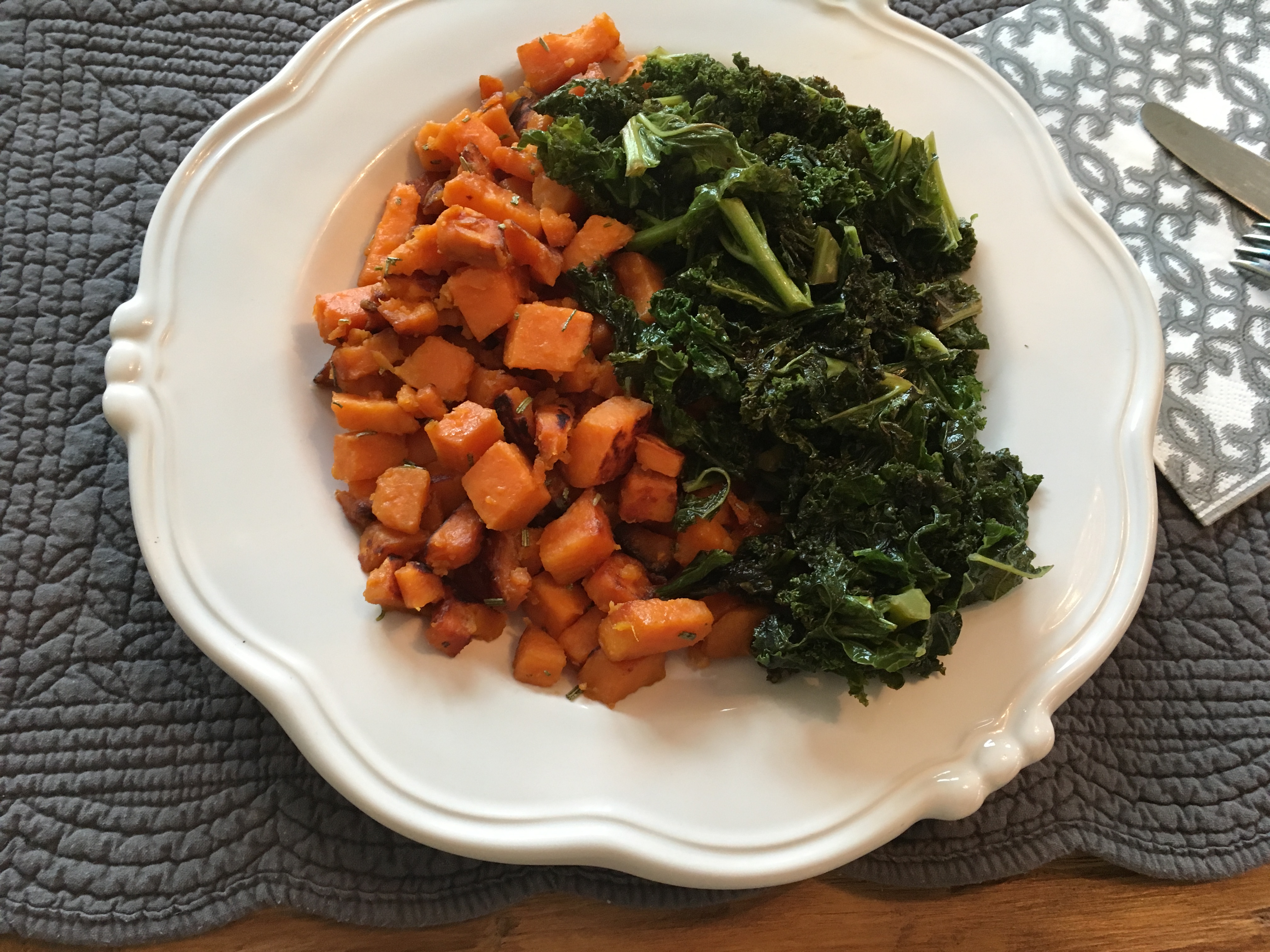 Als Beilage passen Süßkartoffeln, wie ich finde, sehr gut. Die Süßkartoffeln schälen und in kleine Würfel schneiden. In einer separaten Pfanne Kokosöl erhitzen und aus den Süßkartoffelwürfeln schöne Bratkartoffeln braten. Vor dem Servieren salzen und je nach Geschmack mit etwas Rosmarin würzen.