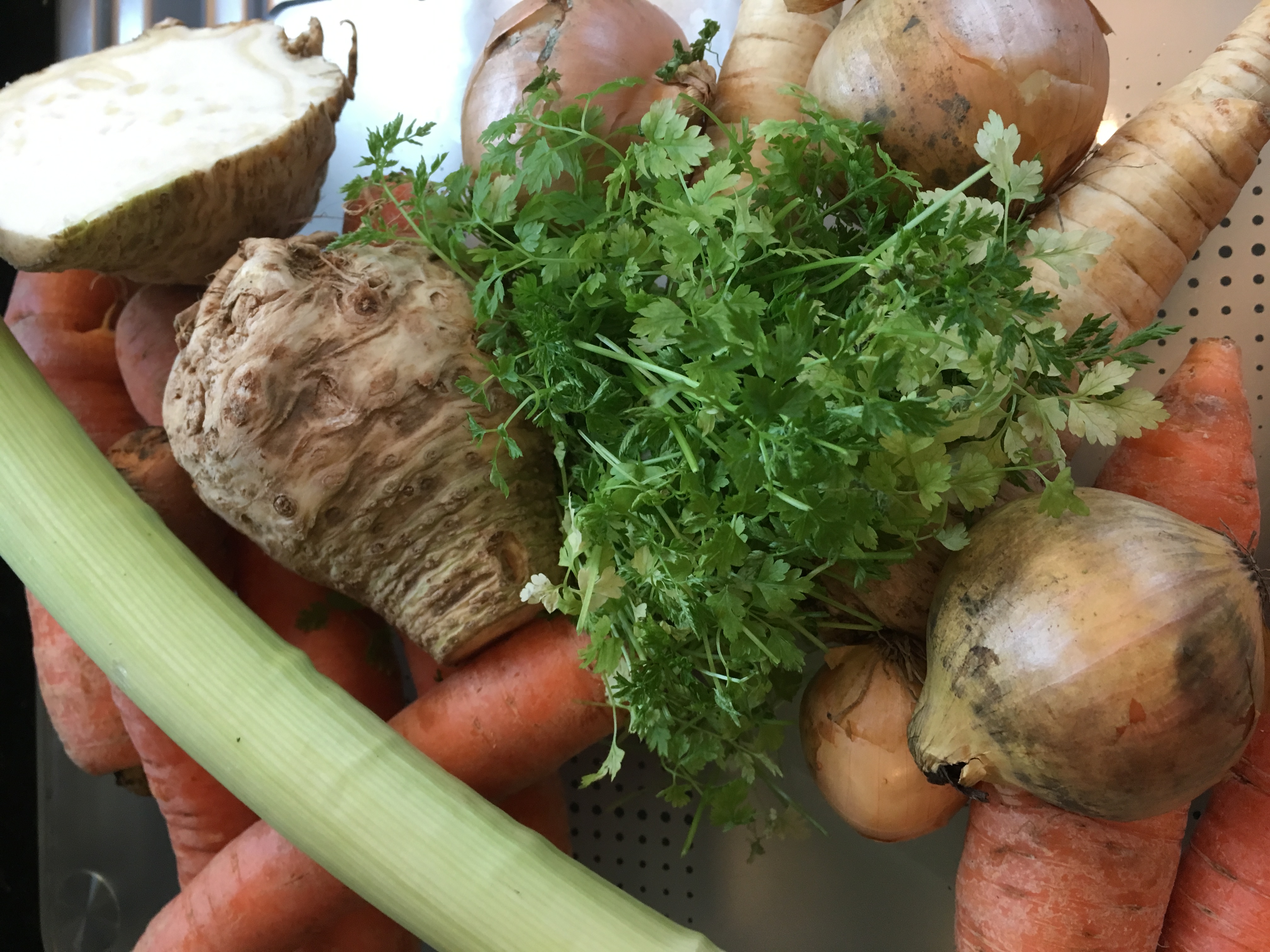 Das Gemüse schälen, waschen und grob klein schneiden. Alles mit dem Rapsöl in einem großen Topf von allen Seiten anbraten. Salzen und dann mit Wasser ablöschen, einmal kurz aufkochen lassen und im geschlossenen Topf bei geringer Temperatur ca. 1 Stunde köcheln lassen. Dann die Suppe durch ein Sieb gießen und die Brühe mit Salz und Pfeffer abschmecken. Wenn du magst, kannst du sie vor dem Servieren mit klein gehacktem Kerbel oder Petersilie bestreuen.