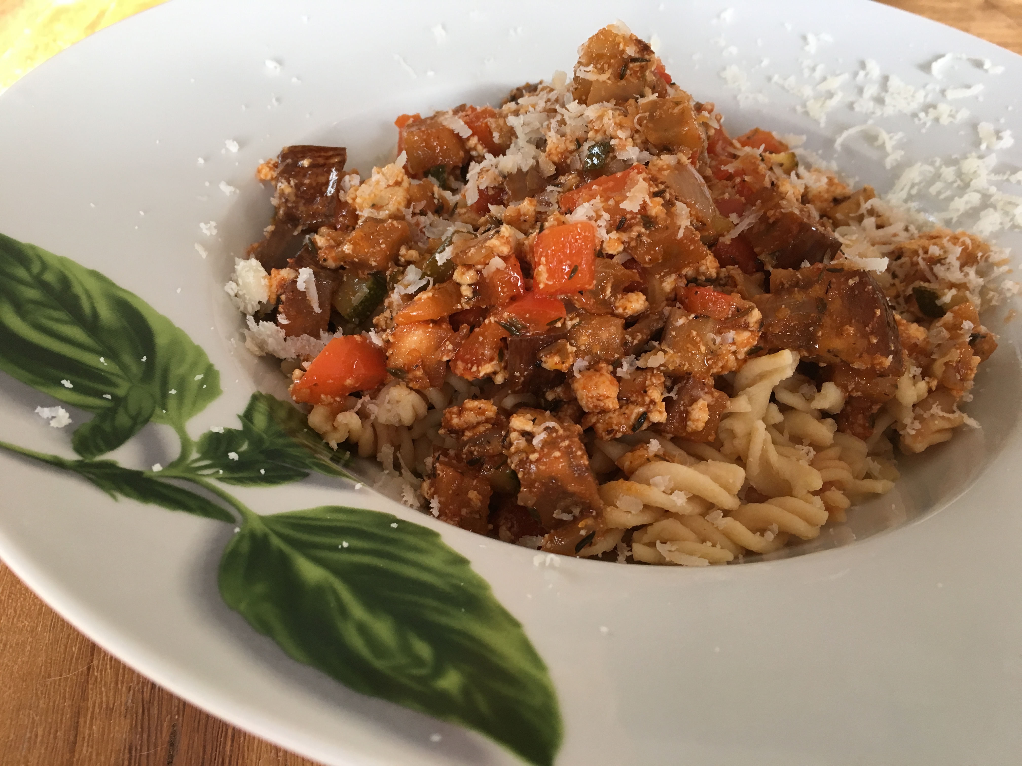 Zwiebeln und Knoblauchzehen schälen und fein würfeln. In einer großen Pfanne etwas Olivenöl erhitzen und Zwiebeln und Knoblauch darin anbraten. Tofu aus der Verpackung nehmen und in einer Schüssel mit der Gabel oder mit den Händen zerkrümeln. Auch in die Pfanne geben und mit anbraten. Aubergine, Zucchini und Paprika waschen, in kleine Würfel schneiden und ebenfalls mit in die Pfanne geben. Alles hin und wieder wenden, damit es nicht anbrennt. Dann mit etwas Wasser ablöschen und das Tomatenmark einrühren. Jetzt die Temperatur zurücknehmen, die Kräuter und Gewürze dazu geben und alles so lange köcheln lasssen, bis das Gemüse gar ist, aber noch etwas Biss hat.