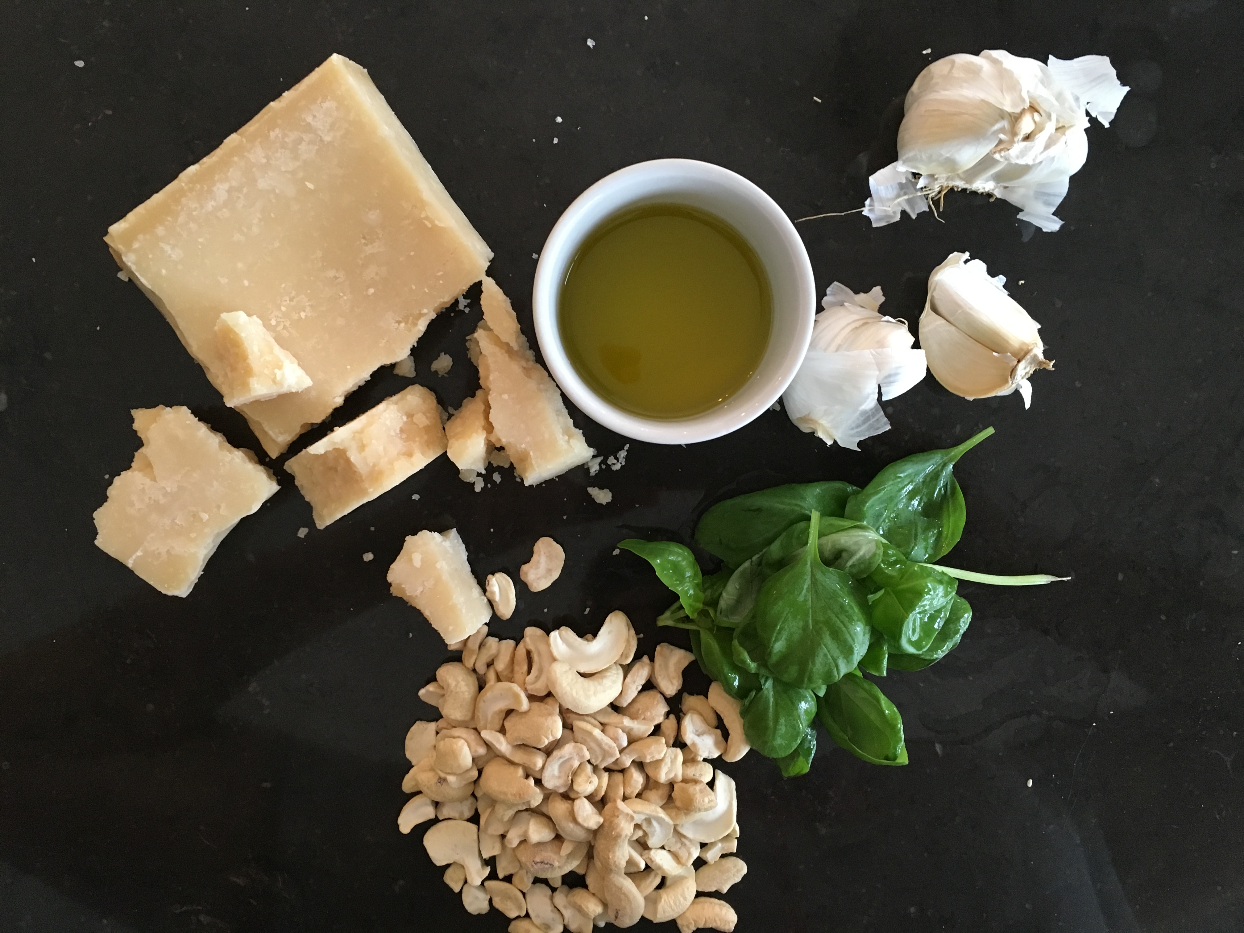 Basilikumblätter waschen, Knoblauchzehe schälen und zusammen mit dem Parmesan, dem Olivenöl und den Cashewkernen in den Mixer geben (ich habe den Smoothie Mixer genommen). Alles gut durchmixen bis eine Paste entsteht, dann mit Salz und Pfeffer abschmecken.