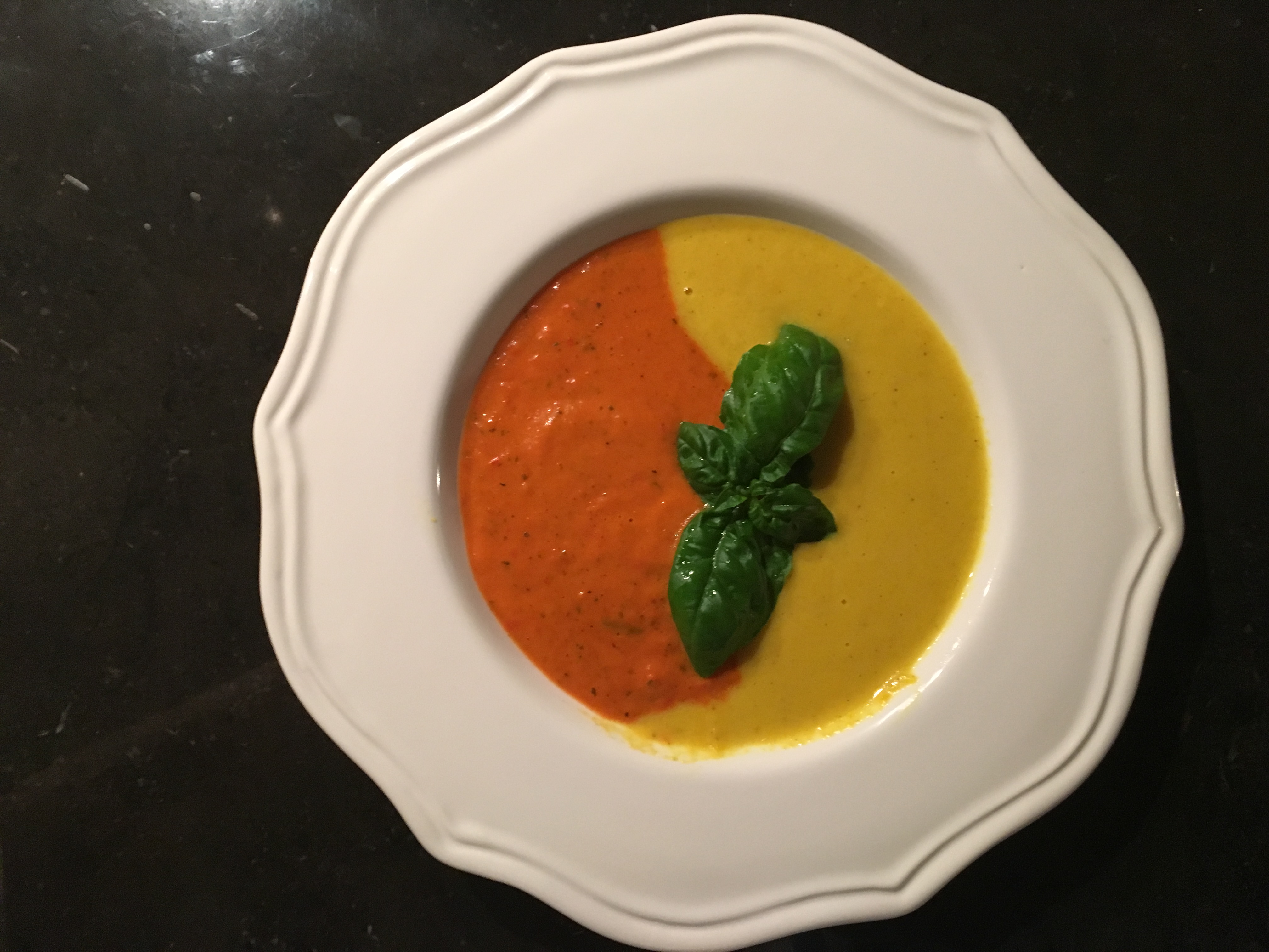 Diese beiden Paprikasuppen schmecken völlig unterschiedlich. Du kannst dich selbstverständlich auch nur für eine Suppe entscheiden. Ich habe mir gedacht, dass beide zusammen auf einem Teller schön aussehen. Der Ingwer gibt der gelben Suppe eine schöne Schärfe. Sie schmeckt eher exotisch. Die rote hat einen typisch mediterranen, tomatigen Geschmack. Beide Suppen enthalten wenig Kohlenhydrate. Du kannst sie also sehr gut zum Abendessen kochen.