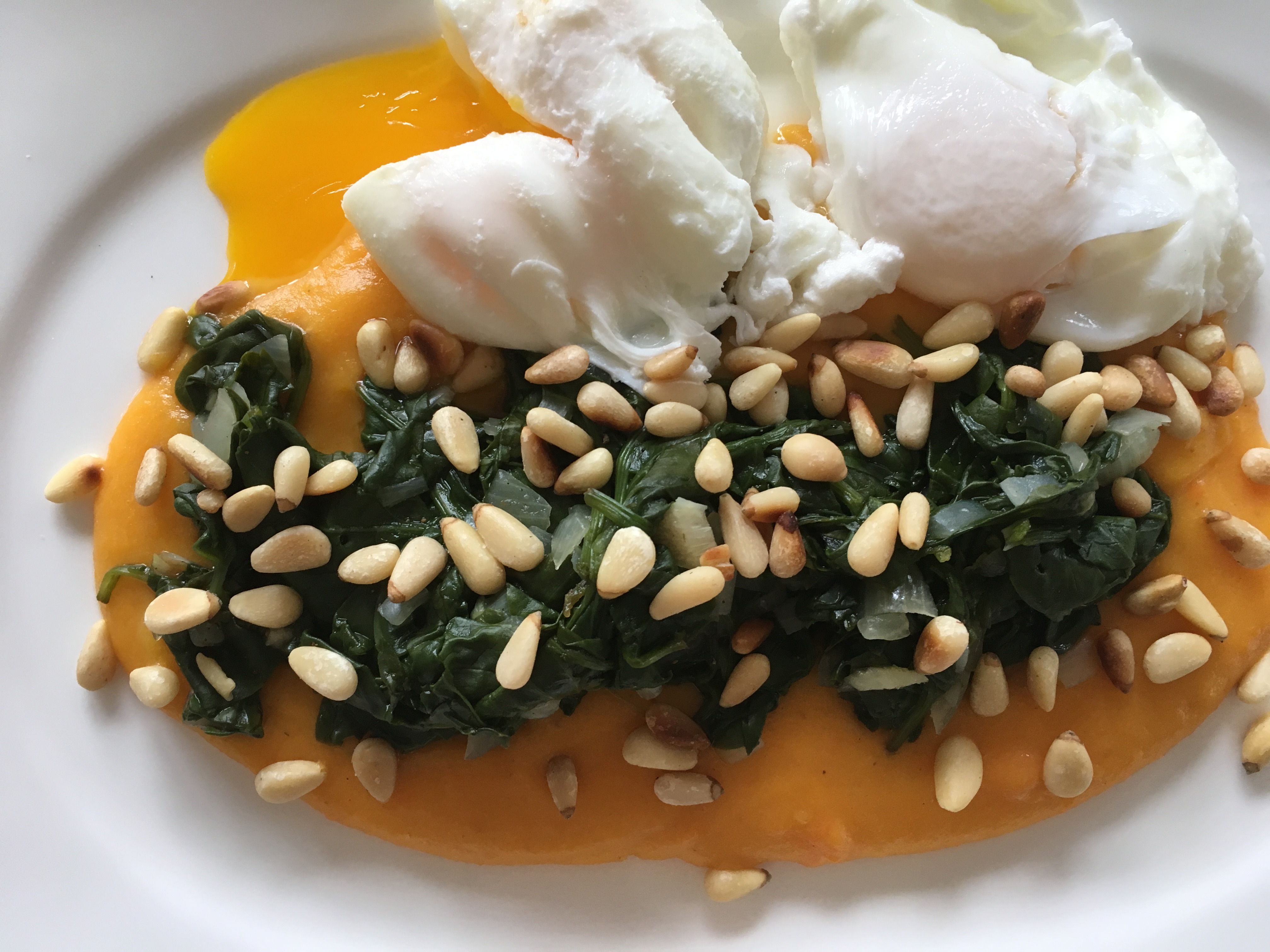 Zuerst den Karotten-Kartoffel-Stampf auf den Teller streichen. Darauf dann den Spinat drapieren und pro Person ein bis zwei Eier an den Rand legen und leicht salzen. Am Ende alles mit den gerösteten Pinienkernen bestreuen.